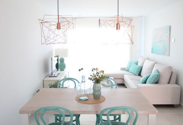 - Jugar con el contraste : Aunque los colores claros son ideales, eso no significa que debas renunciar al contraste. Agregar detalles en colores más oscuros o complementarios puede darle profundidad y dinamismo al espacio, siempre que se utilicen con moderación para evitar recargar visualmente el ambiente.