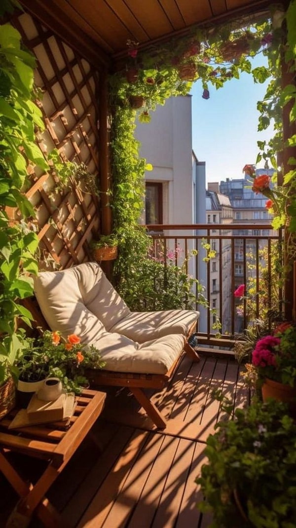 - Verticalidad: Aprovechar las paredes y barandillas del balcón es esencial. Instala estantes flotantes para exhibir plantas, velas decorativas o pequeñas esculturas. También puedes colgar macetas en ganchos o utilizar jardineras verticales para cultivar hierbas o flores, creando así un hermoso jardín vertical que no ocupe mucho espacio en el suelo.