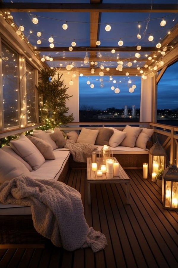 - Iluminación Creativa: La iluminación adecuada puede transformar por completo la atmósfera de un balcón pequeño. Opta por luces LED empotradas en el suelo o en las paredes para crear un ambiente acogedor por la noche. Las velas, linternas o guirnaldas de luces también son excelentes opciones para añadir un toque de calidez y encanto.
