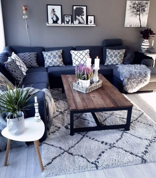 La segunda propuesta muestra una pared que cuenta con un tono gris oscuro donde se agrega un sofá azul . El gris y el azul forman parte de una combinación que queda bien y siempre la puedes utilizar para todo tipo de decoración. Los accesorios decorativos completan el lugar aportando detalles asombrosos que se encuentran en cada uno de los textiles utilizados en la alfombra y los cojines.