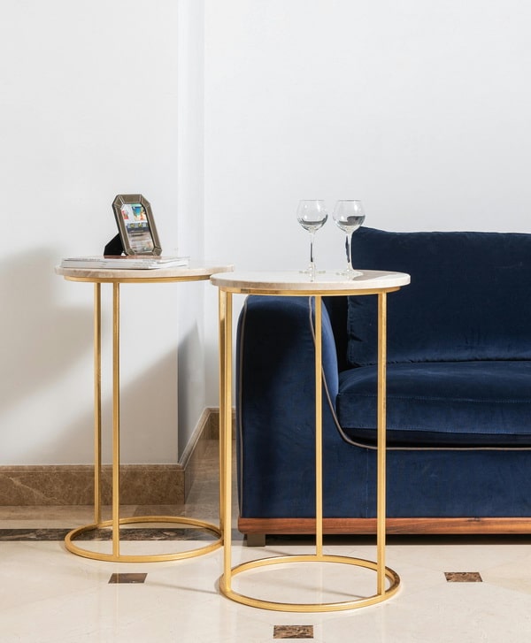 - Salones: Combina sofás grises con mesas de centro doradas para un ambiente contemporáneo. Agregue cuadros con marcos dorados o lámparas metálicas para completar el look.