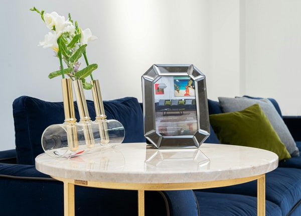 - Salas de estar: Los sofás en colores pastel, como el azul o el verde, se ven fantásticos con mesas auxiliares doradas o lámparas con acabados metálicos.