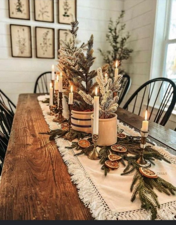 Si prefieres un enfoque clásico, un arreglo floral con flores de temporada como flores de pascua blancas, acompañadas de ramas verdes y velas, siempre es una apuesta segura. Para un estilo más moderno, considere usar jarrones de cristal rellenos de bolas navideñas en tonos metálicos, o incluso un conjunto de velas flotantes en recipientes transparentes con toques de acebo o rodajas de naranja seca.