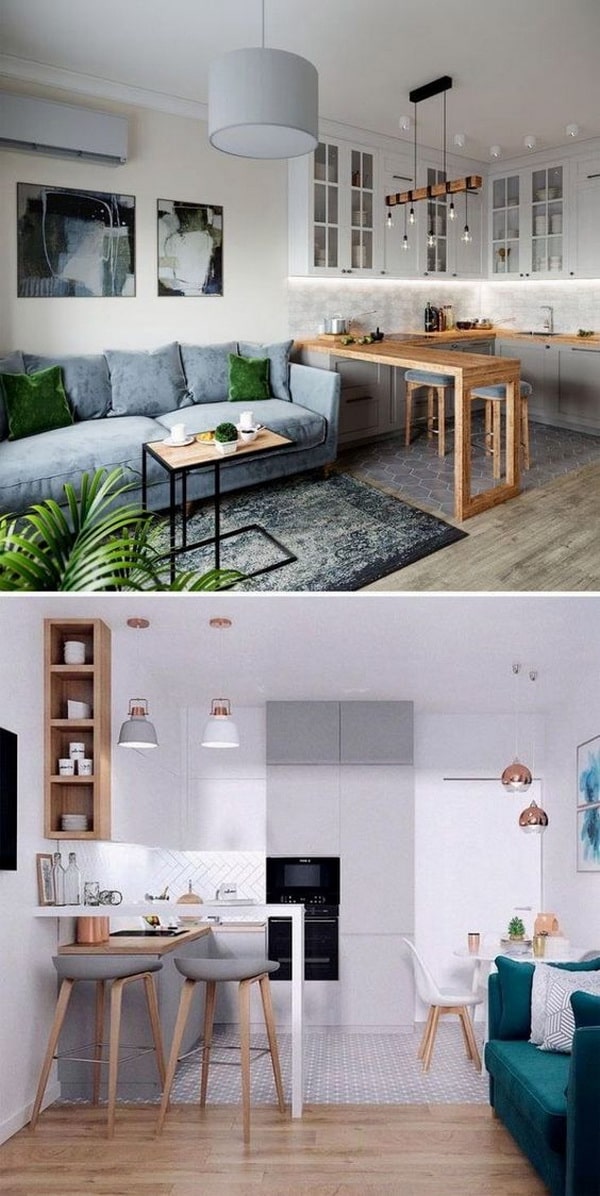 Además de los muebles tradicionales, considera la opción de utilizar muebles multifuncionales o elementos divisorios como una isla de cocina con espacio para almacenamiento y una barra puede servir como una transición entre la cocina y la sala de estar. También puedes utilizar estanterías o paneles de vidrio como divisores visuales para crear una separación sutil entre las diferentes áreas.